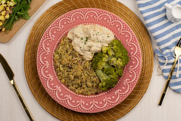 Um frango suculento com um molho bem verão, a quinoa com legumes colorindo o prato e, de quebra, brócolis ao vapor, com o sabor e textura naturais bem preservados, só à espera da sua mordida.